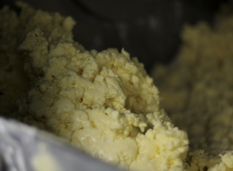 The cooled and fermented cream is added to the mechanical churn, at which point it is churned vigorously to agitate and break the fat globules, causing them to coalesce and separate from the buttermilk. The mechanical action of churning disrupts the gel-like network formed by the casein micelles, releasing fat globules that cluster together to form the “butter mass”. Churning is a critical step in getting the butter just right. It’s where the majority of the buttermilk is removed, while saving all of that delicious fat. It is a perfect balance of cream input speed, beaters, and moving the captured fat along in the process.
